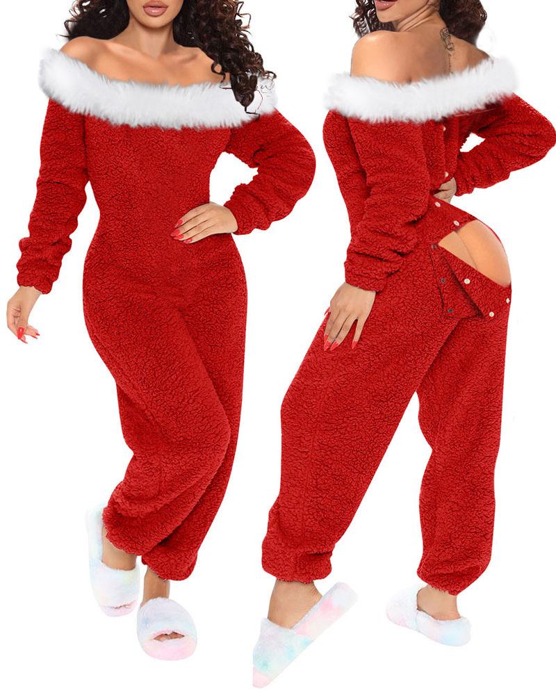 Christmas Fuzzy Trim Off Shoulder Flap Pajamas Jumpsuit
