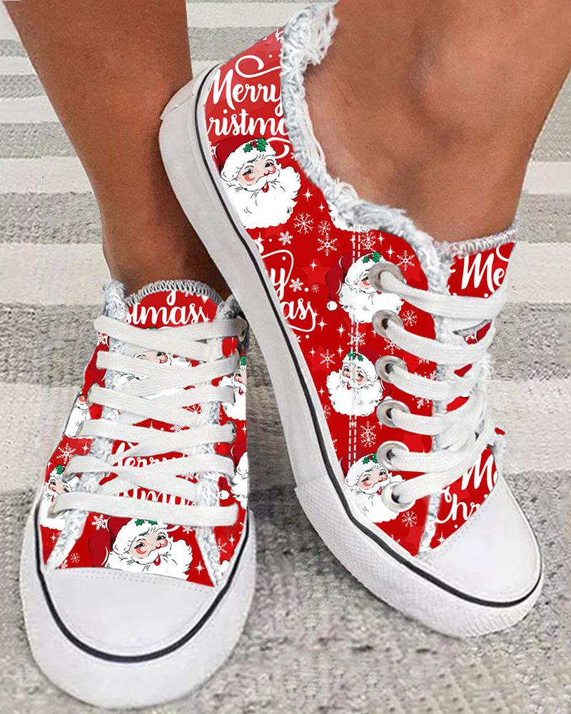 Merry Christmas Berry Hatted Santa Claus Print Raw Hem Sneakers
