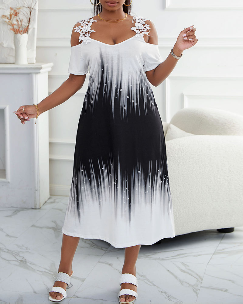 Style:Casual,Chic Type:Straight Material:Polyester Neckline:Cold Shoulder Sleeve Style:Short Sleeve Length:Maxi Pattern Type:Ombre,Tie Dye Decoration:Contrast Lace Fit Type:Regular Occasion:Daily,Vacation Package Include:1* Dress Fabric Elasticity:Slight Stretch