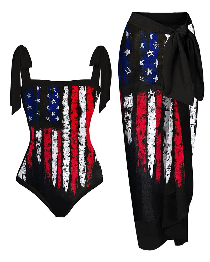 Independence Day Flag Ink Splash Print One Piece Swimsuit With Cover Up