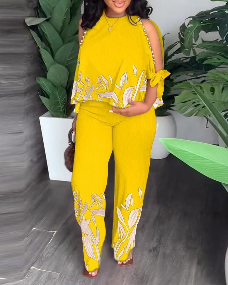 Style:Elegant Type:Pants Sets Material:97%Polyester,3%Spandex Neckline:O-neck Sleeve Style:Three Quarters Length:Long Pattern Type:Plants Decoration:Tied Detail Fit Type:Regular Occasion:Daily,Work Package Include:1*Pants Set Fabric Elasticity:Non-Stretch Sleeve Type:Split Sleeve Sheer:No Care Instructions:Machine wash or professional dry clean Waist Line:High Waist