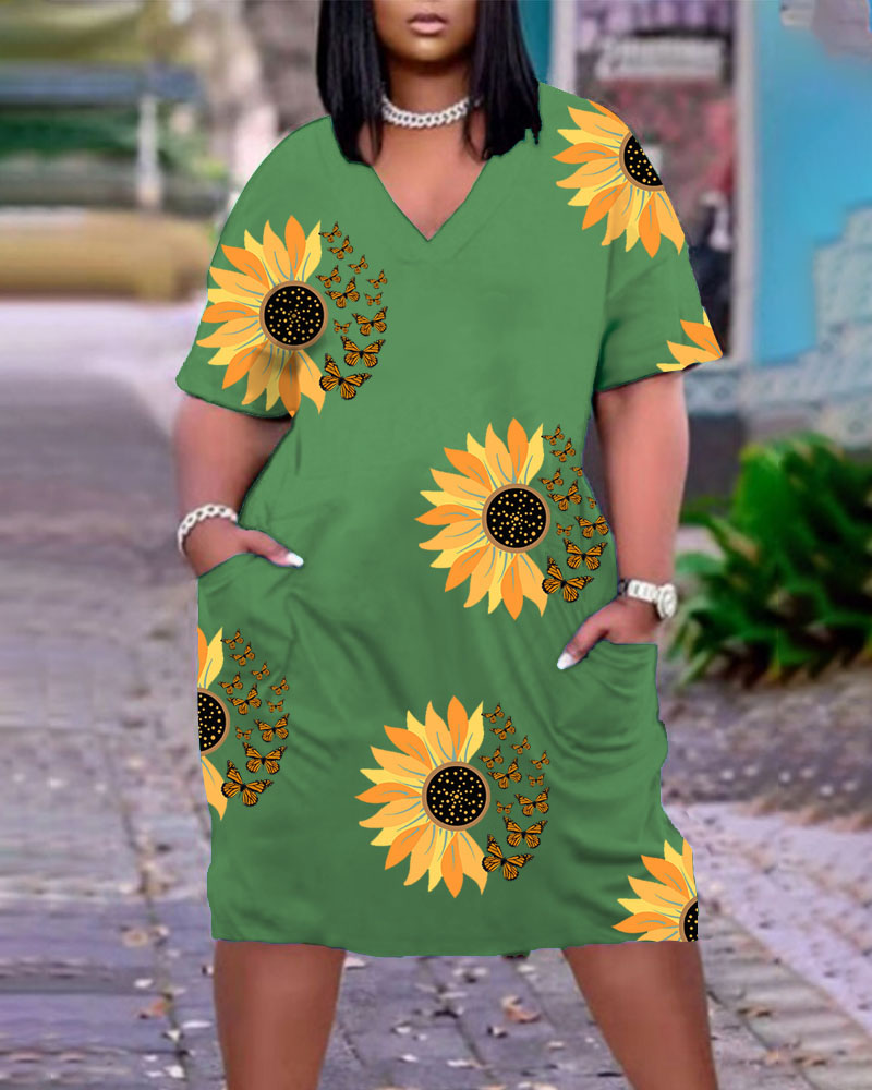 Style:Casual Type:Straight Material:97%Polyester,3%Spandex Neckline:V-Neck Sleeve Style:Short Sleeve Length:Midi Pattern Type:Butterfly,Sunflower Decoration:Pocket Fit Type:Regular Occasion:Daily Package Include:1* Dress Fabric Elasticity:Slight Stretch Sheer:No Care Instructions:Machine wash or professional dry clean Waist Line:Natural