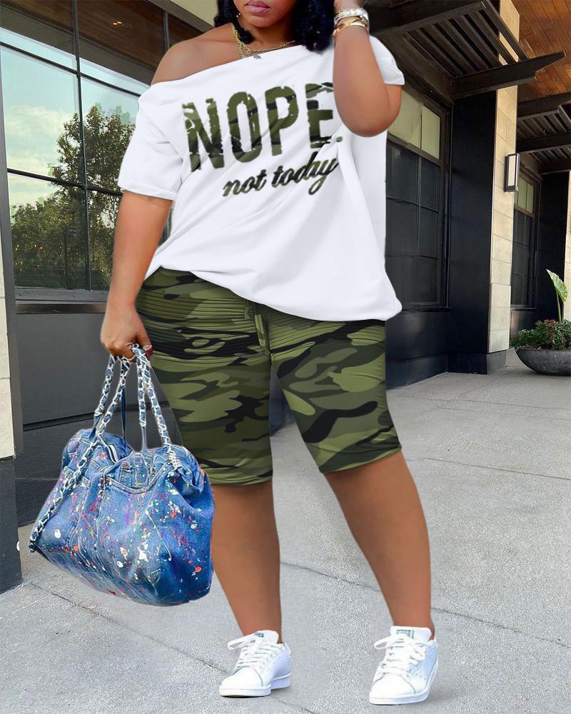 Plus Size Nope Not Today Camouflage Print Skew Neck Top & Shorts Set