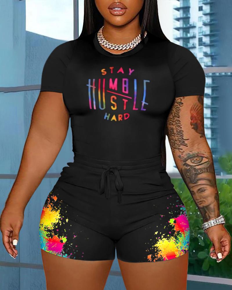 Plus Size Slogan Graphic Tee & Ink Splash Print Shorts Set