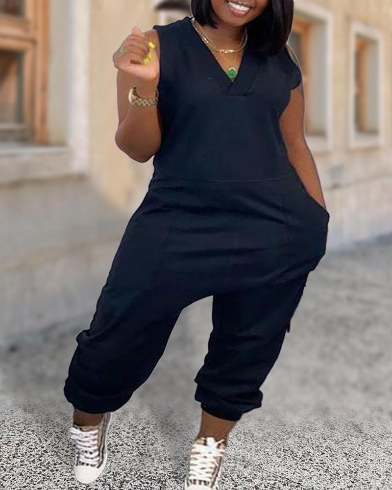 Plus Size Figure Letter Print Pocket Design Jumpsuit
