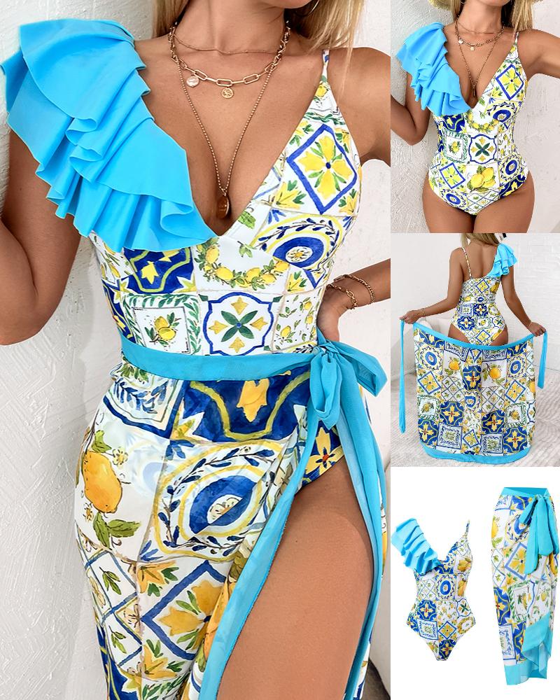Scarf Print Ruffle Hem One-Piece Swimsuit With Cover Up