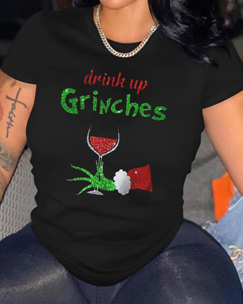 Christmas Graphic Wine Glass Print Casual T-shirt