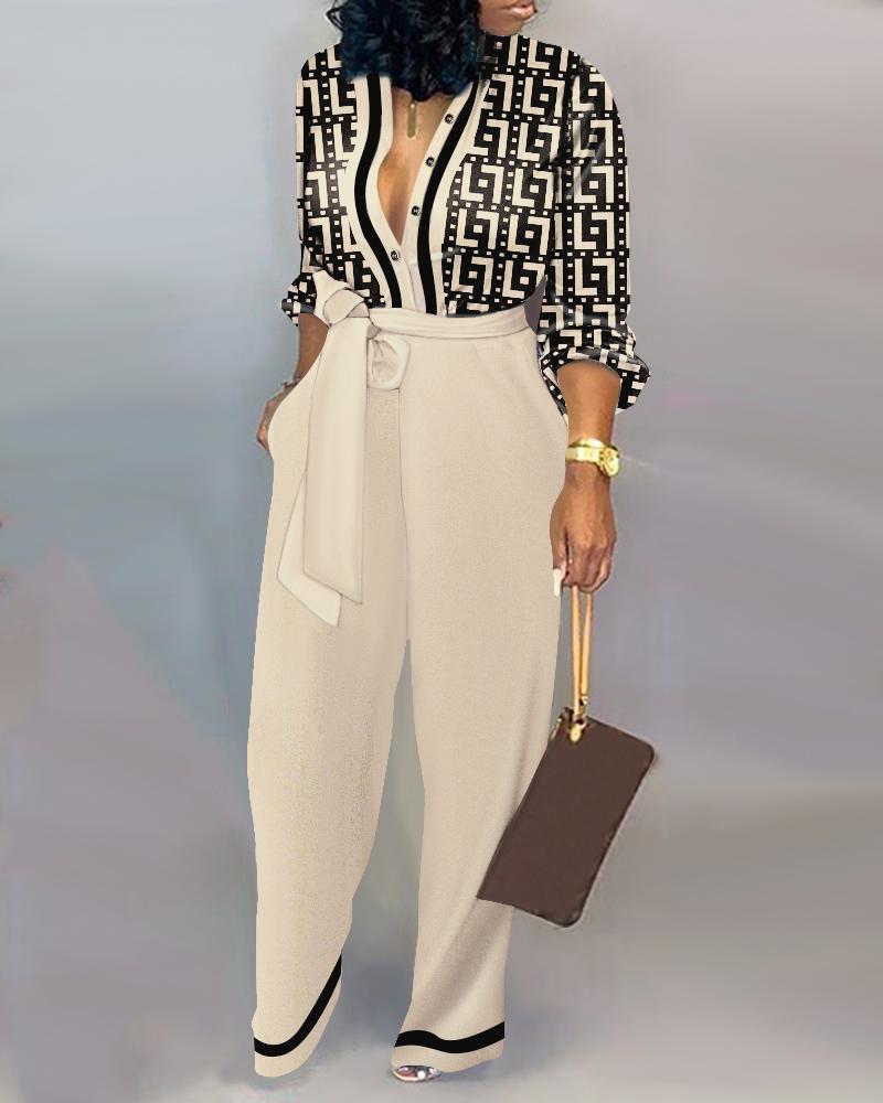 Style:Casual,Elegant Type:Jumpsuit Material:100%Polyester Neckline:Turn-down Collar Sleeve Style:Long Sleeve Length:Long Pattern Type:Geometric Decoration:Button,Pocket Fit Type:Regular With Belt:Yes Occasion:Daily,Work Package Include:1*Jumpsuit (With Belt) Fabric Elasticity:High Stretch Sheer:No Care Instructions:Machine wash or professional dry clean