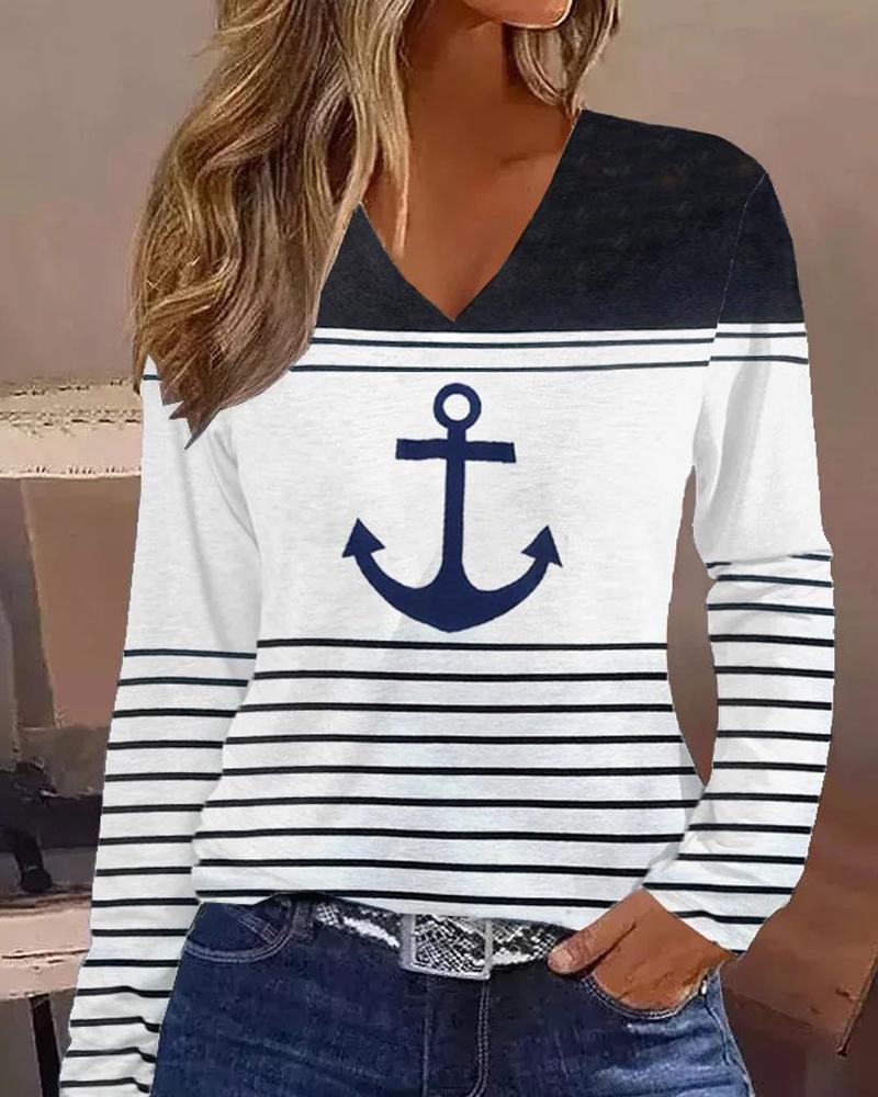Anchor Print Striped Colorblock V-Neck Long Sleeve Top