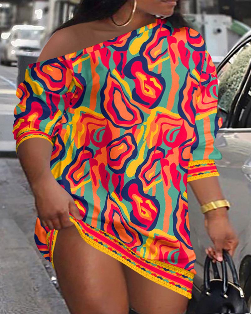 Plus Size Multi-Color Abstract Print Skew Neck Casual Dress