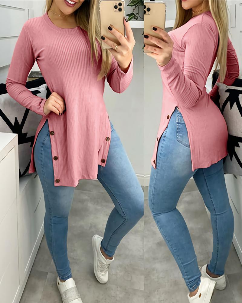 Style:Casual Type:Ribbed Top Material:Ribbed Neckline:O-neck Sleeve Style:Long Sleeve Length:Regular Pattern Type:Plain Decoration:Button,Slit Fit Type:Regular Occasion:Daily Package Include:1*T-Shirt Fabric Elasticity:Slight Stretch Sheer:No Care Instructions:Machine wash or professional dry clean