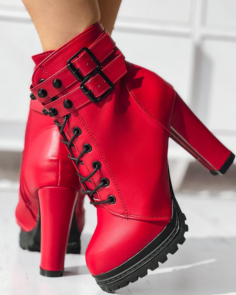 Eyelet Lace-up Buckled Chunky Heel Combat Boots