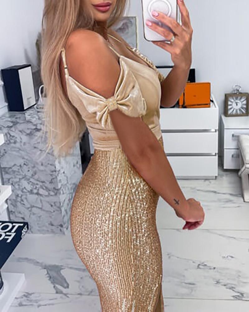 Style:Glamorous,Sexy Type:Slit Material:100%Sequin,92%Polyester,8%Elastane Neckline:Cold Shoulder Sleeve Style:Short Sleeve Length:Maxi Pattern Type:Plain Decoration:Contrast Sequin Fit Type:Skinny Occasion:Evening,Night Out,Party,Wedding Guest Package Include:1* Dress