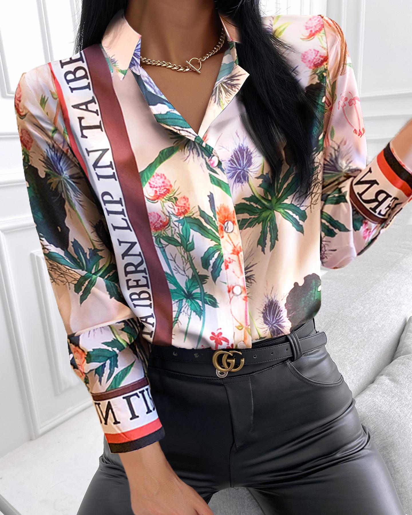 Style:Casual,Chic Type:Shirt Material:Polyester Neckline:Turn-down Collar Sleeve Style:Long Sleeve Length:Regular Pattern Type:Floral Decoration:Button Fit Type:Regular With Belt:No Occasion:Daily Package Include:1*T-Shirt