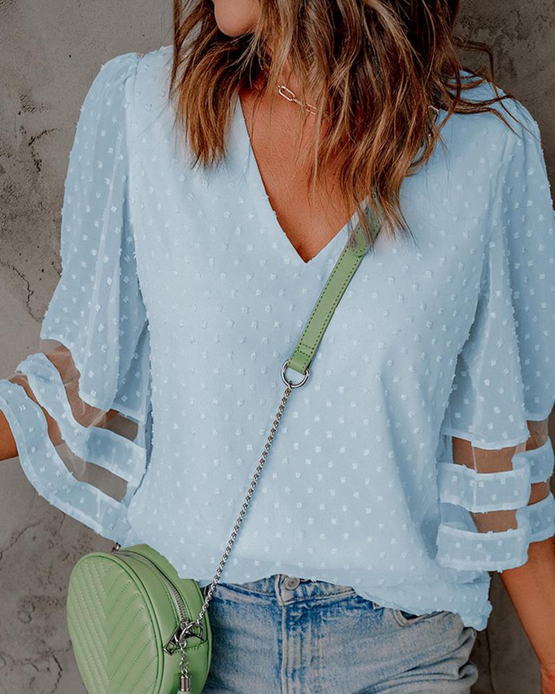 Style:Casual Type:Blouses Material:97%Polyester,3%Spandex Neckline:V-Neck Sleeve Style:Bell Sleeve,Three Quarters Length:Regular Pattern Type:Contrast Paneled Decoration:Sheer Mesh Fit Type:Regular Occasion:Daily Package Include:1* Blouse