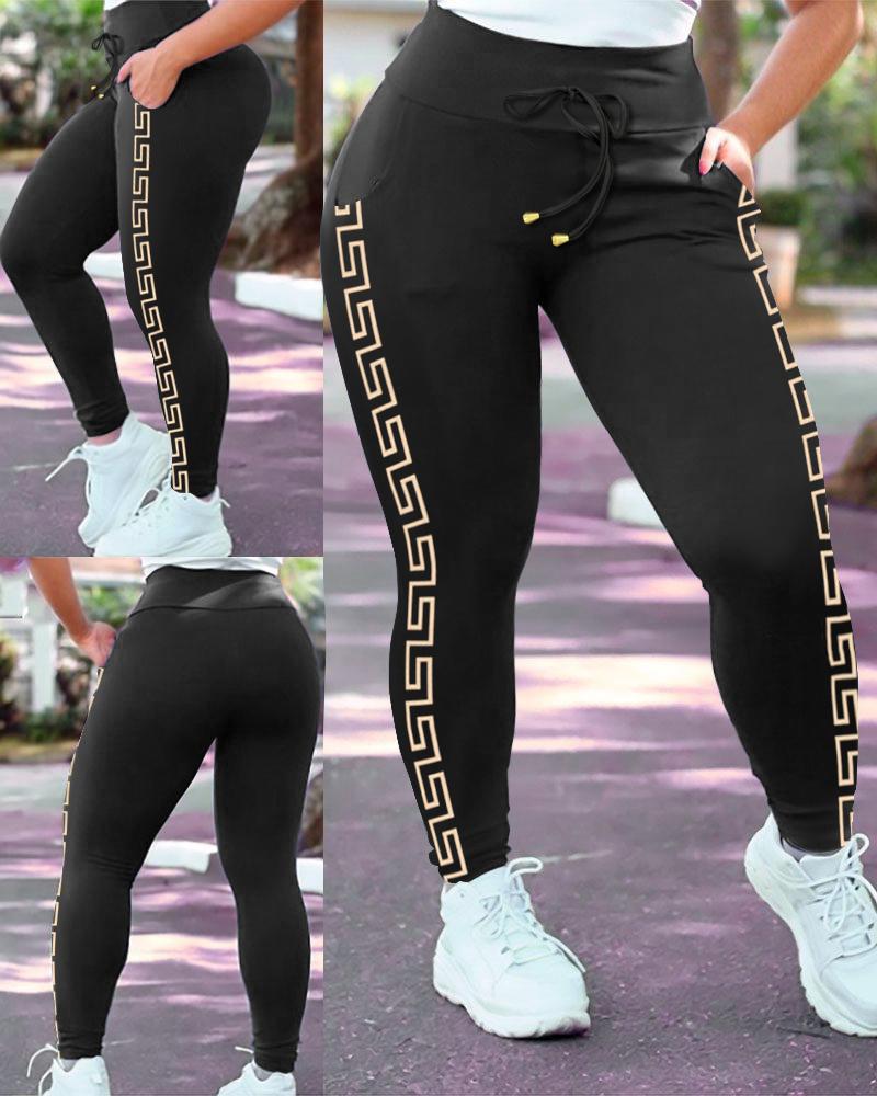 Style:Casual Type:Skinny Pants Material:89%Polyester,11%Elastane Length:Long Pattern Type:Geometric Decoration:Drawstring,Pocket Fit Type:Skinny Occasion:Daily Package Include:1*Pants Fabric Elasticity:Non-Stretch Sheer:No Care Instructions:Machine wash or professional dry clean Waist Line:High Waist