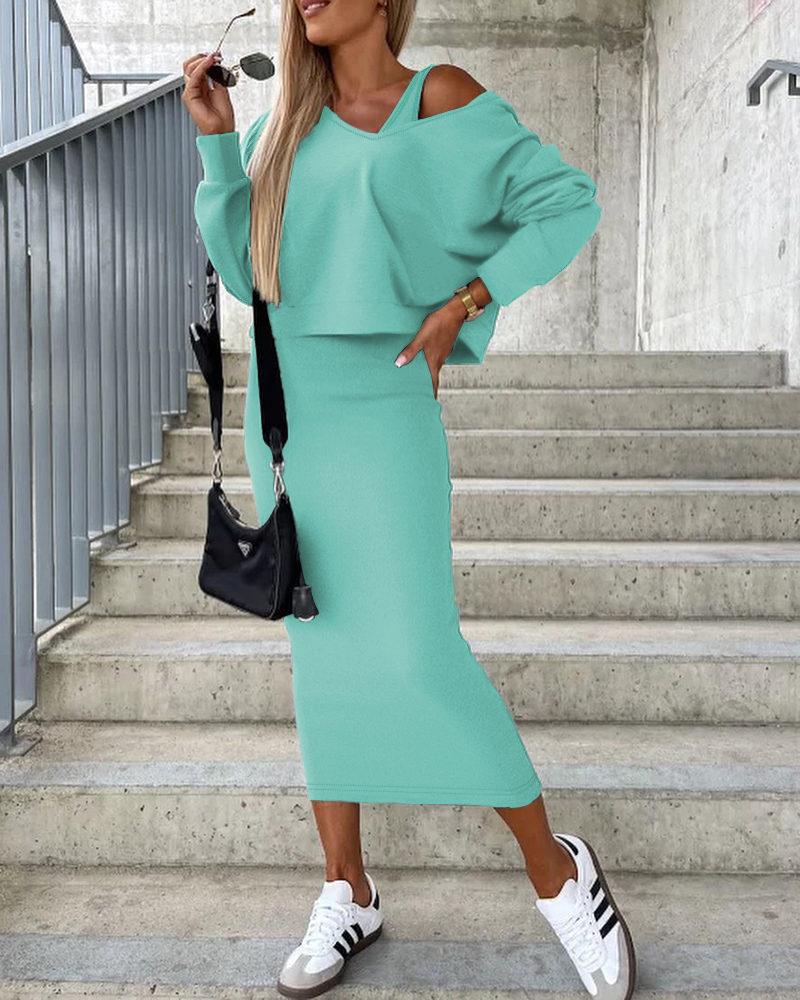 Style:Casual,Chic Type:Suit Set Material:95%Polyester,5%Elastane Neckline:V-Neck Sleeve Style:Sleeveless Length:Mid-Calf Pattern Type:Plain Decoration:Others Fit Type:Regular Occasion:Daily Package Include:1*Dress & Top Set Fabric Elasticity:Medium Stretch Sheer:No Care Instructions:Machine wash or professional dry clean