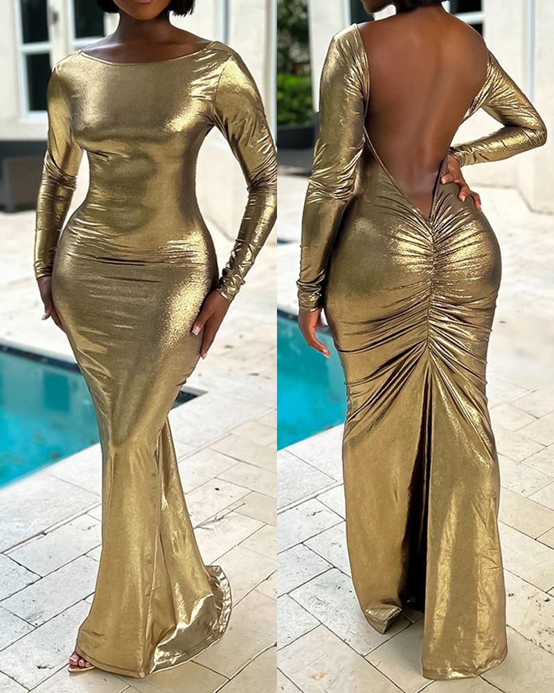 Metallic Long Sleeve Mermaid Ruched Evening Dress
