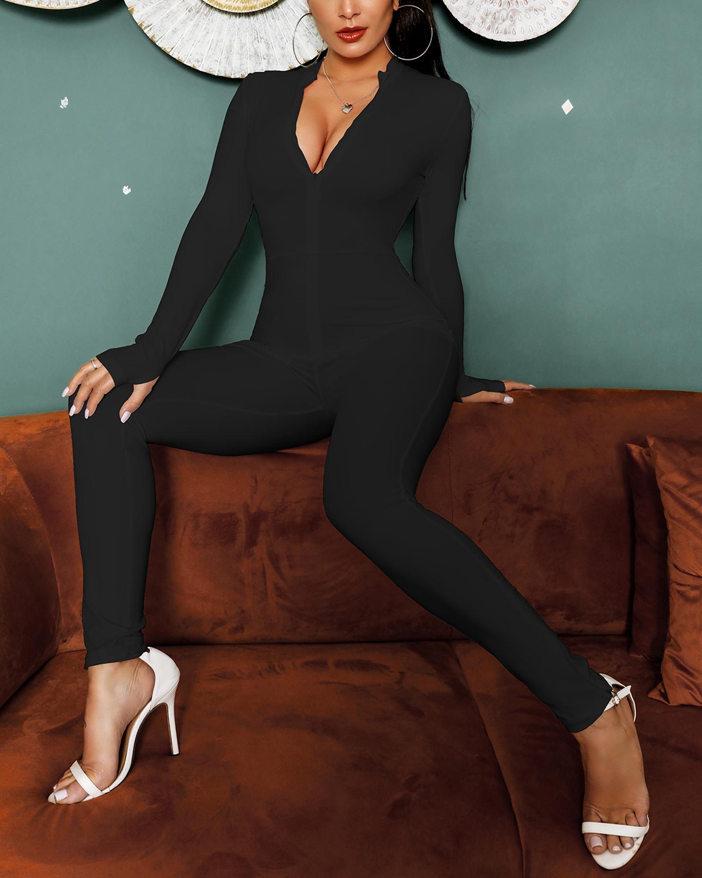 Style:Sexy,Chic Material:Polyester Neckline:V-Neck Sleeve Style:Long Sleeve Length:Long Pattern Type:Plain Fit Type:Skinny Occasion:OTTD,Work Package Include:1*Jumpsuit Note: There might be 2-3% difference according to manual measurement. Please check the measurement chart carefully before you buy the item. +Please note that slight color difference should be acceptable due to the light and screen.