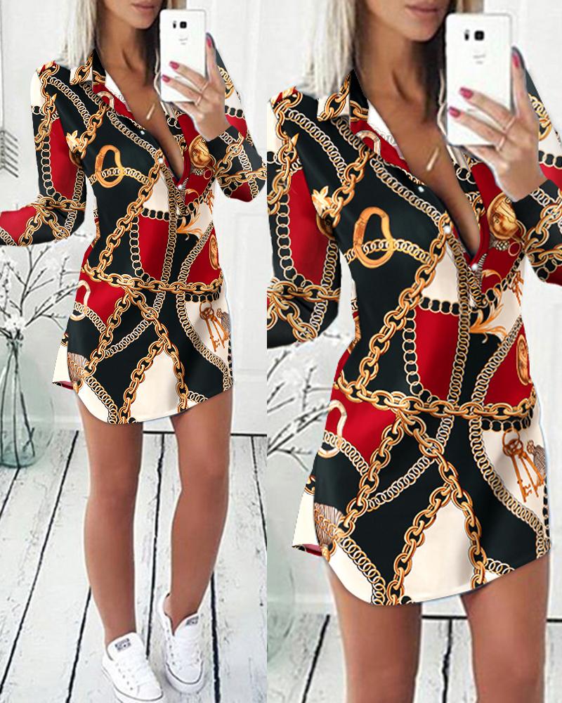 Chain Print Colorblock Turn-down Collar Buttoned Dress