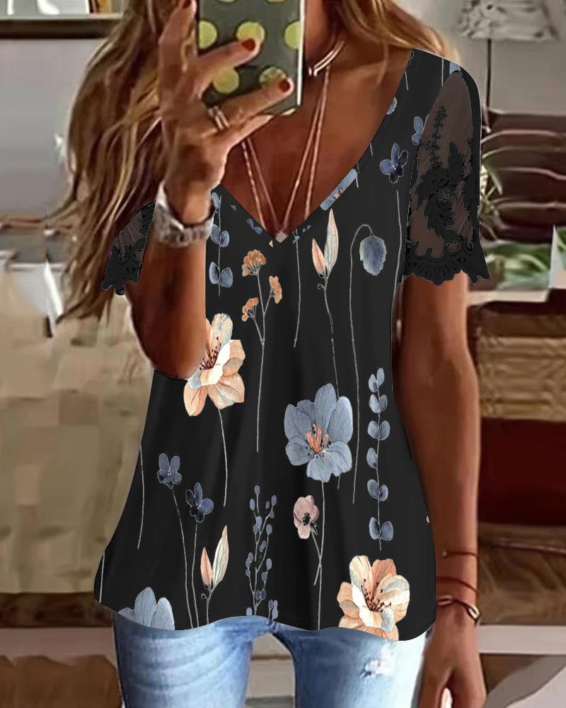 Style:Casual,Chic Type:Tee Material:97%Polyester,3%Spandex Neckline:V-Neck Sleeve Style:Short Sleeve Length:Regular Pattern Type:Floral Decoration:Contrast Lace Fit Type:Regular Occasion:Daily Package Include:1*T-Shirt Fabric Elasticity:Non-Stretch Sheer:No Care Instructions:Machine wash or professional dry clean