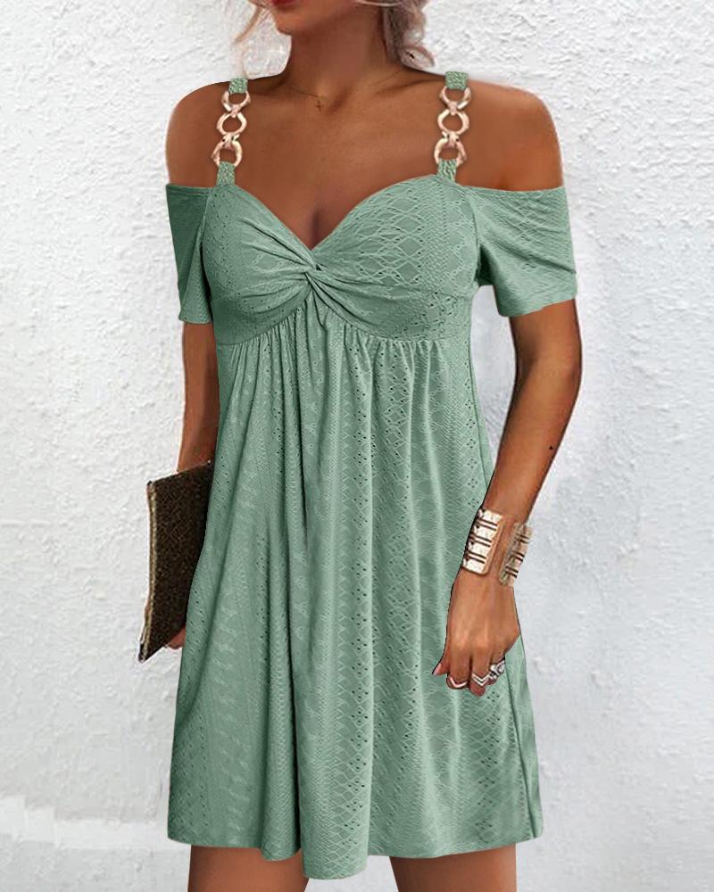 Style:Casual,Chic Type:A Line Material:95%Polyester,5%Elastane Neckline:Cold Shoulder Sleeve Style:Short Sleeve Length:Mini Pattern Type:Plain Decoration:Chain,Eyelet Embroidery,Ruched,Twist Fit Type:Regular Occasion:Daily Package Include:1* Dress Fabric Elasticity:Slight Stretch Sheer:No Care Instructions:Machine wash or professional dry clean