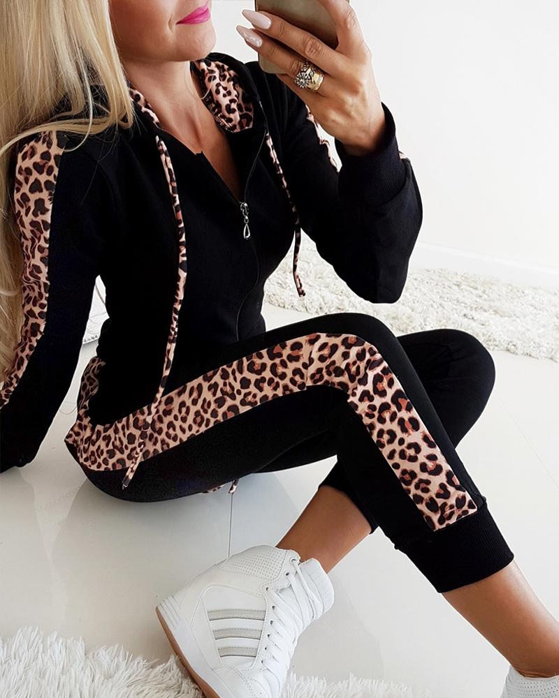 Leopard Print Zipper Design Drawstring Hooded Top & Pants Set