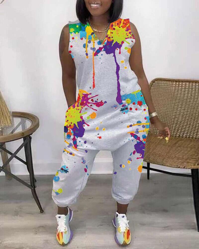 Ink Splash Print Sleeveless Pocket Design Jumpsuit