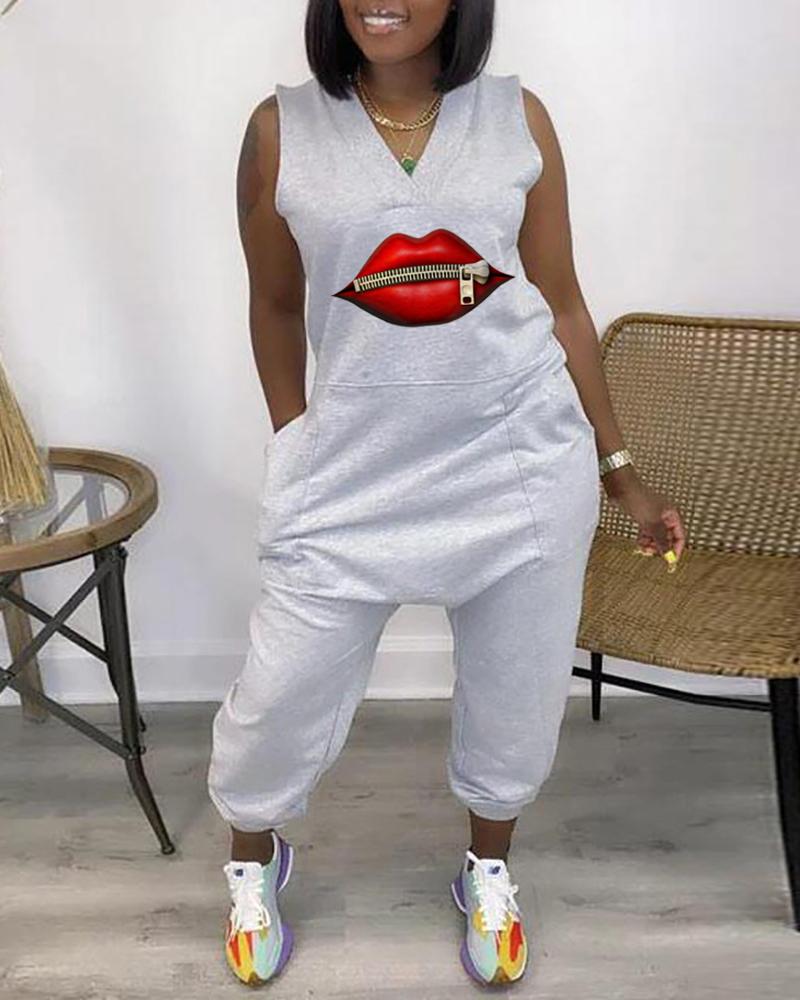 Pocket Design Lip Zipper Print Sleeveless Jumpsuit