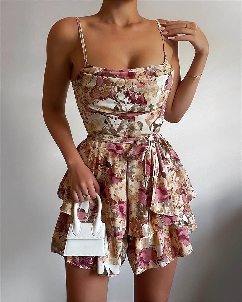 Floral Print Cowl Neck Layered Ruffles Romper
