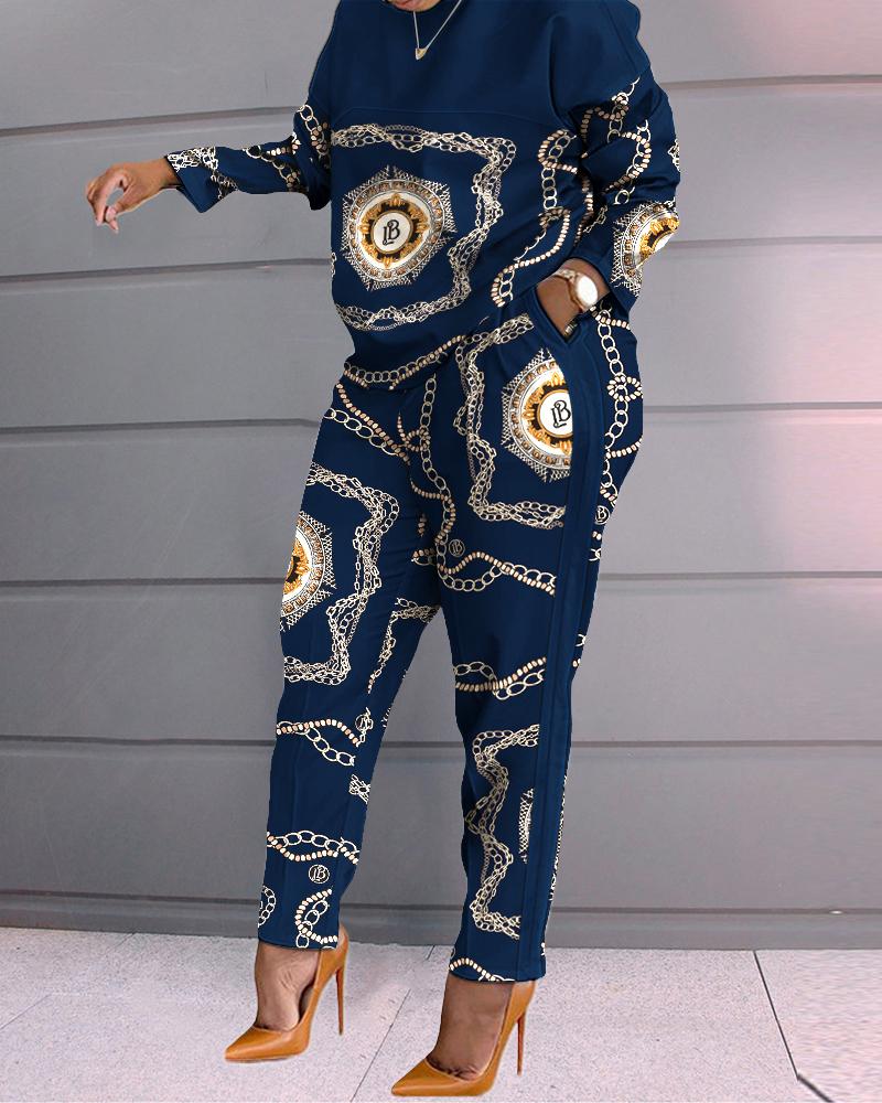 Plus Size Chain Print Long Sleeve Top & Pants Set