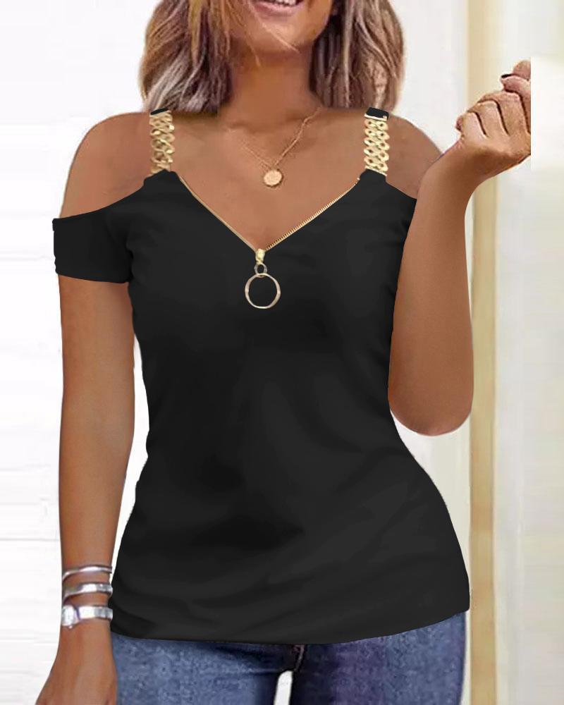 Style:Casual Type:Tee Material:97%Polyester,3%Spandex Neckline:Cold Shoulder Sleeve Style:Short Sleeve Length:Regular Pattern Type:Plain Decoration:Zipper Fit Type:Regular Occasion:Daily Package Include:1*T-Shirt Fabric Elasticity:Medium Stretch Sheer:No Care Instructions:Machine wash or professional dry clean