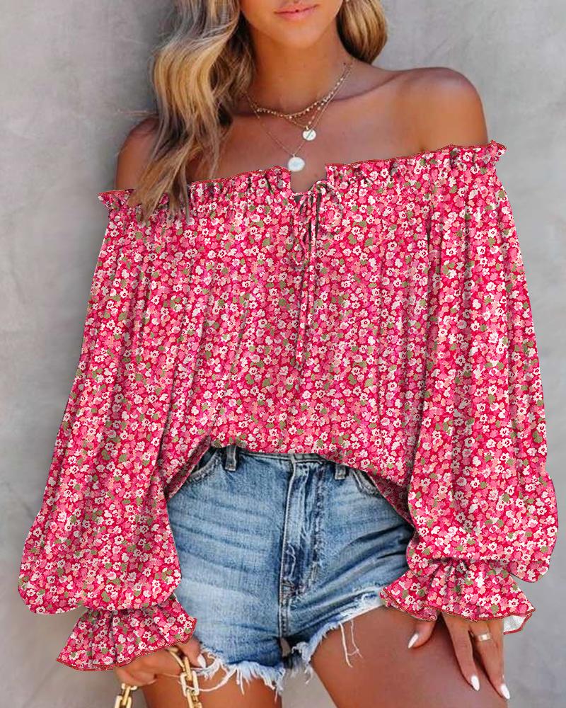 Style:Sexy Type:Blouses Material:100%Polyester Neckline:Off the Shoulder Sleeve Style:Lantern Sleeve,Long Sleeve Length:Regular Pattern Type:Ditsy Floral Decoration:Frill Hem,Lantern Sleeve,Tied Detail Fit Type:Regular Occasion:Daily Package Include:1* Blouse Fabric Elasticity:Slight Stretch Sheer:No Care Instructions:Machine wash or professional dry clean