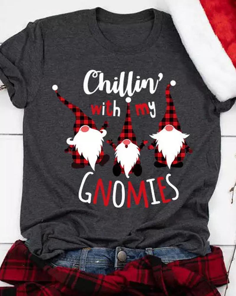 Christmas Letter Gnome Print Casual T-shirt