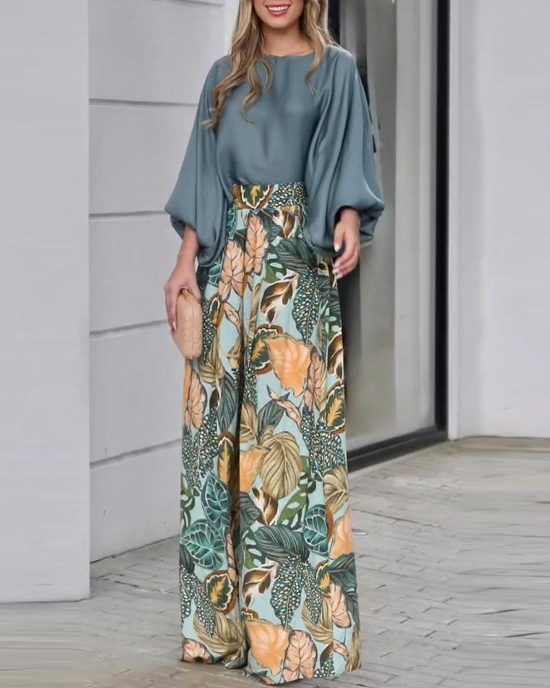 Lantern Sleeve Top & Tropical Print High Waist Pants Set
