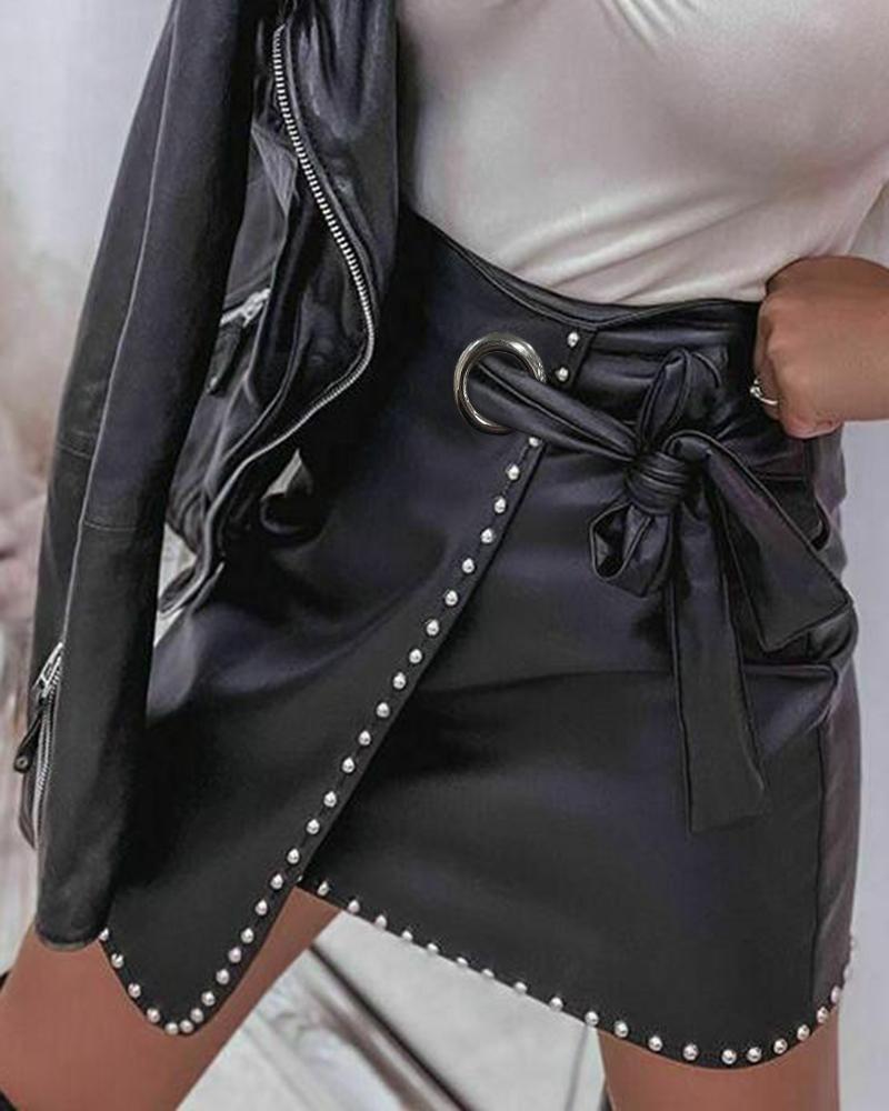Beaded Decor Ruffle Hem Asymmetrical PU Leather Skirt