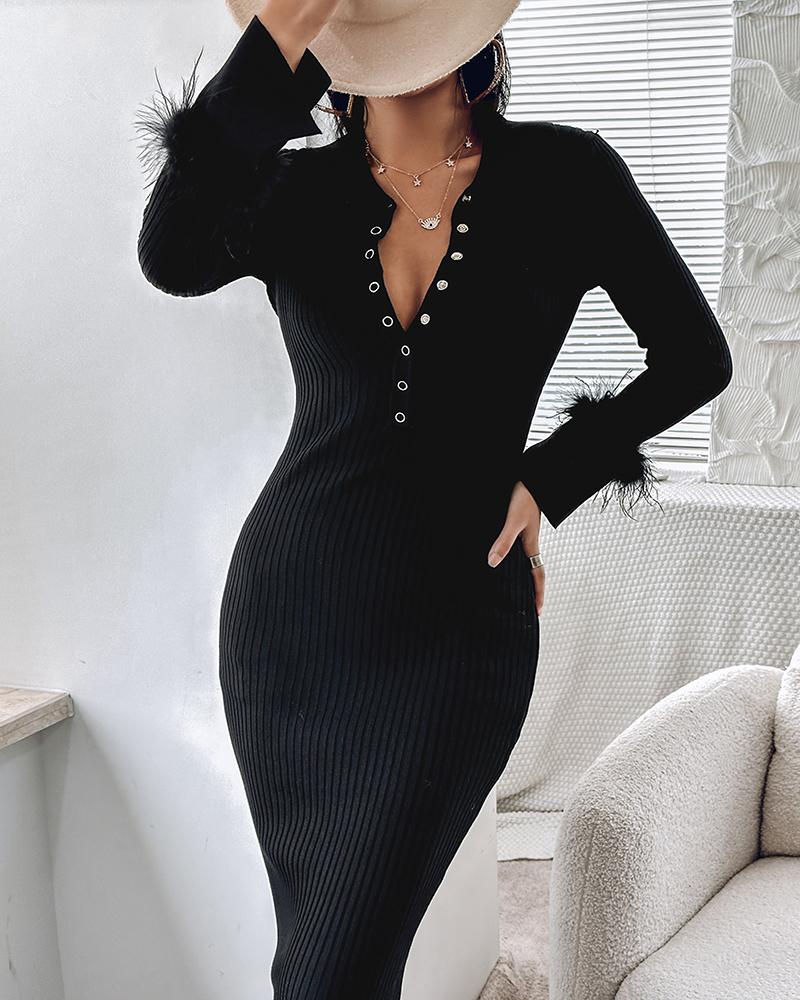 Style:Chic Type:Bodycon Material:100%Acrylic Neckline:Turn-down Collar Sleeve Style:Long Sleeve Length:Mid-Calf Pattern Type:Plain Decoration:Feather Fit Type:Skinny Occasion:Daily Package Include:1* Dress Fabric Elasticity:Medium Stretch Sheer:No Care Instructions:Hand wash, do not dry clean