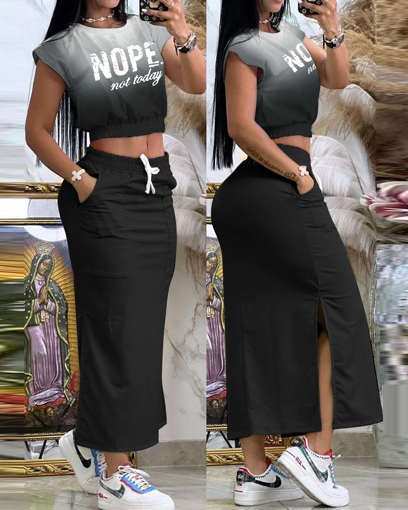 Nope Not Today Print Ombre Crop T-Shirt & Slit Drawstring Skirt Set