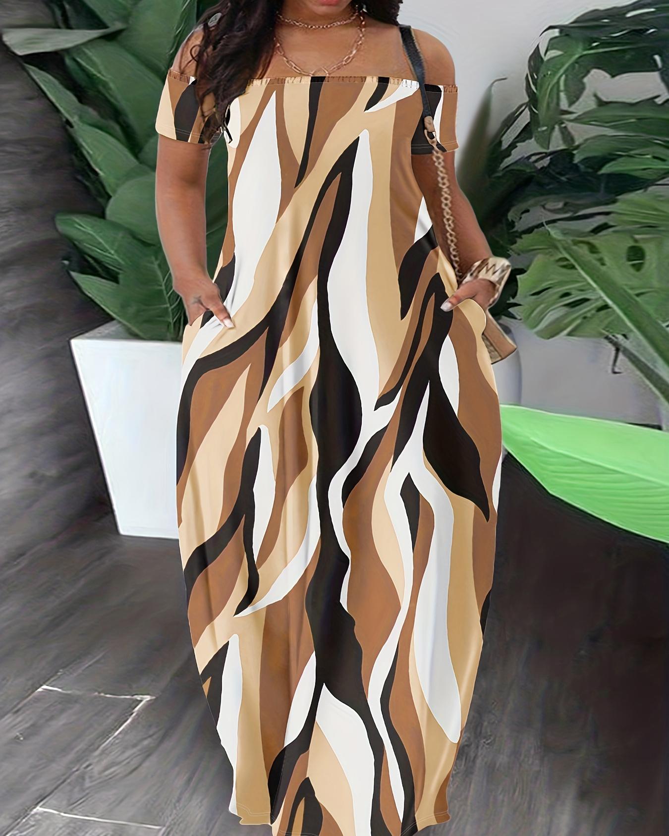 Style:Chic Type:Straight Material:95%Polyester,5%Elastane Neckline:Off the Shoulder Sleeve Style:Short Sleeve Length:Maxi Pattern Type:Abstract Decoration:Pocket Fit Type:Regular Occasion:Daily,Vacation Package Include:1* Dress Fabric Elasticity:Non-Stretch