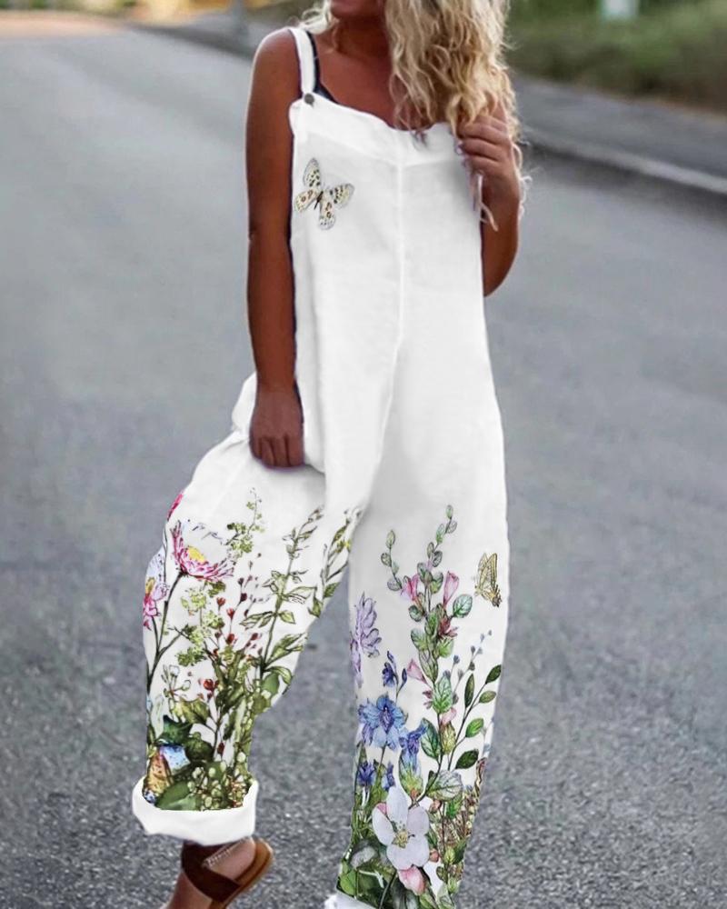 Floral Butterfly Print Csual Suspender Jumpsuit