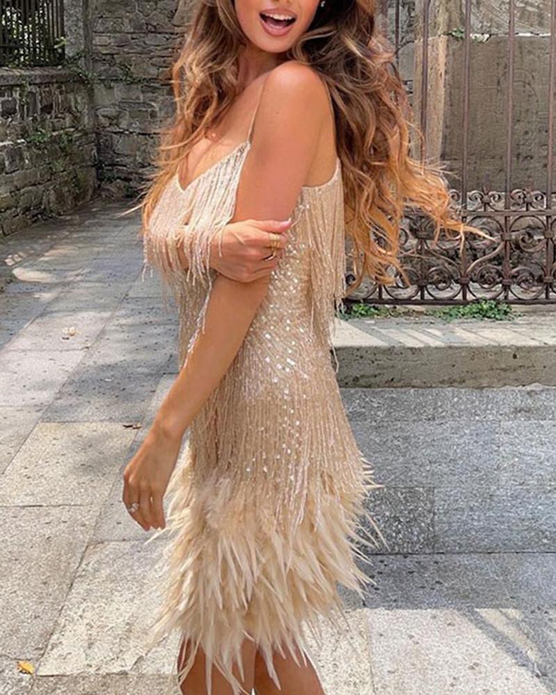 Spaghetti Strap Tassel Design Feather Detail Party Dress