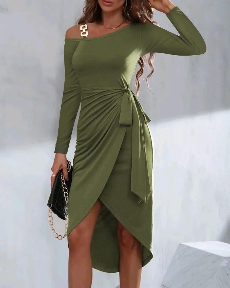 Style:Casual,Chic Type:Asymmetrical,Wrap Material:97%Polyester,3%Spandex Neckline:Cold Shoulder Sleeve Style:Long Sleeve Length:Midi Pattern Type:Plain Decoration:Chain,Tied Detail Fit Type:Regular Occasion:Daily Package Include:1* Dress Fabric Elasticity:Non-Stretch Sheer:No Care Instructions:Machine wash or professional dry clean