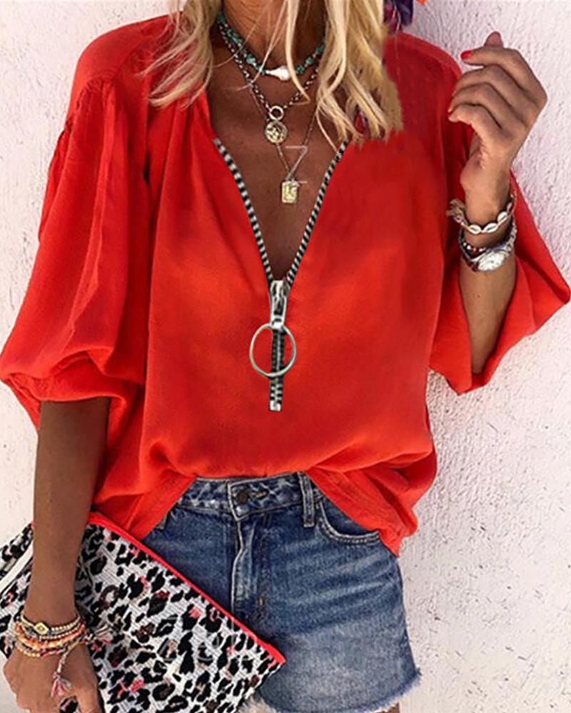 Lantern Sleeve Zipper Design Casual Top