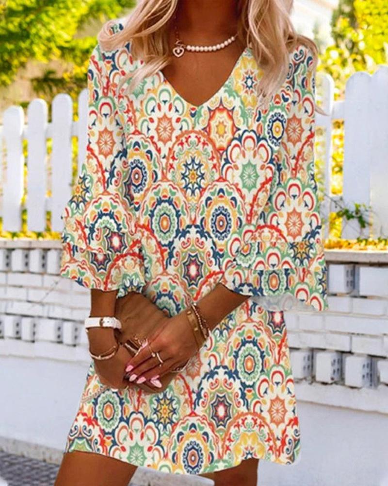 Style:Casual,Vintage Type:Straight Material:97%Polyester,3%Spandex Neckline:V-Neck Sleeve Style:Bell Sleeve,Three Quarters Length:Mini Pattern Type:Tribal Decoration:Others Fit Type:Regular Occasion:Daily,Vacation Package Include:1* Dress Fabric Elasticity:Non-Stretch Sheer:No Care Instructions:Machine wash or professional dry clean