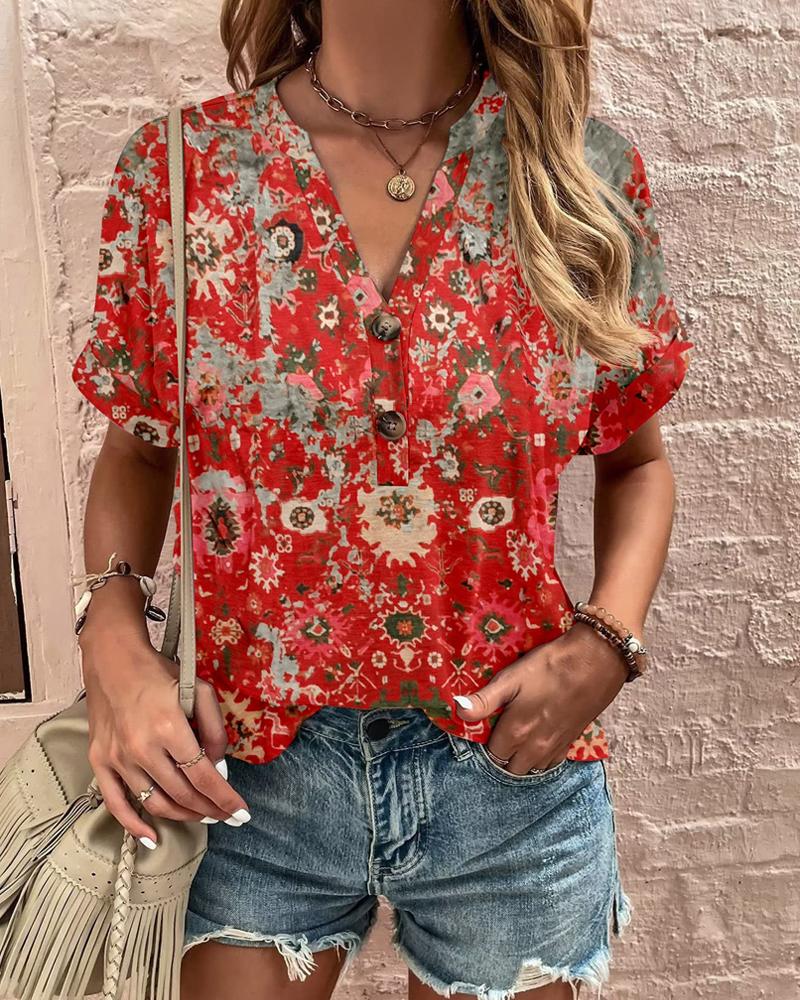 Style:Casual,Vintage Type:Blouses Material:Polyester Neckline:V-Neck Sleeve Style:Short Sleeve Length:Regular Pattern Type:Floral Decoration:Button Fit Type:Regular Occasion:Daily Package Include:1* Blouse