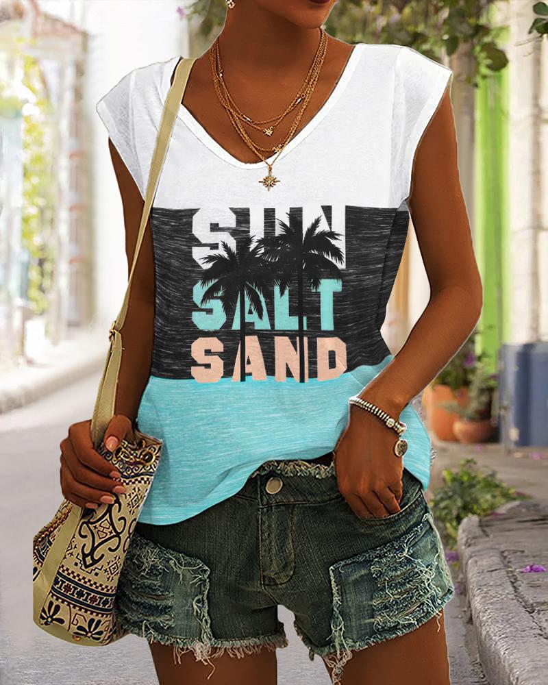 Coconut Tree Landscape Print Cap Sleeve V-Neck Casual T-shirt