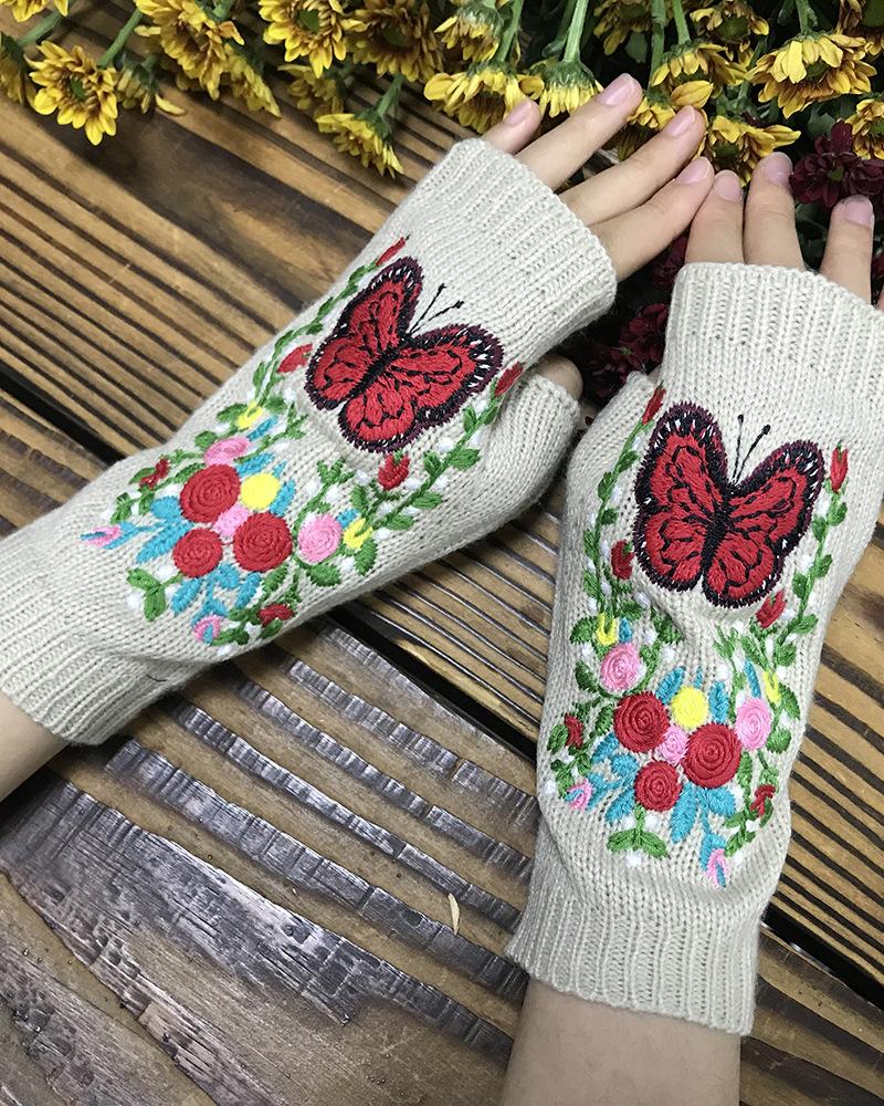 1Pair Floral Butterfly Embroidery Fingerless Knit Gloves