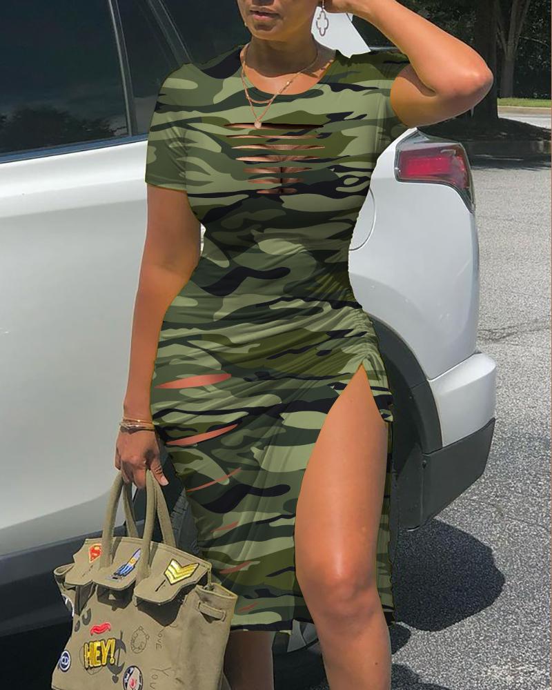 Style:Chic Type:Slit Material:97%Polyester,3%Spandex Neckline:O-neck Sleeve Style:Short Sleeve Length:Midi Pattern Type:Camouflage Decoration:Drawstring,Ruched,Slit Fit Type:Skinny Occasion:Daily Package Include:1* Dress Fabric Elasticity:Non-Stretch Sheer:No Care Instructions:Machine wash or professional dry clean