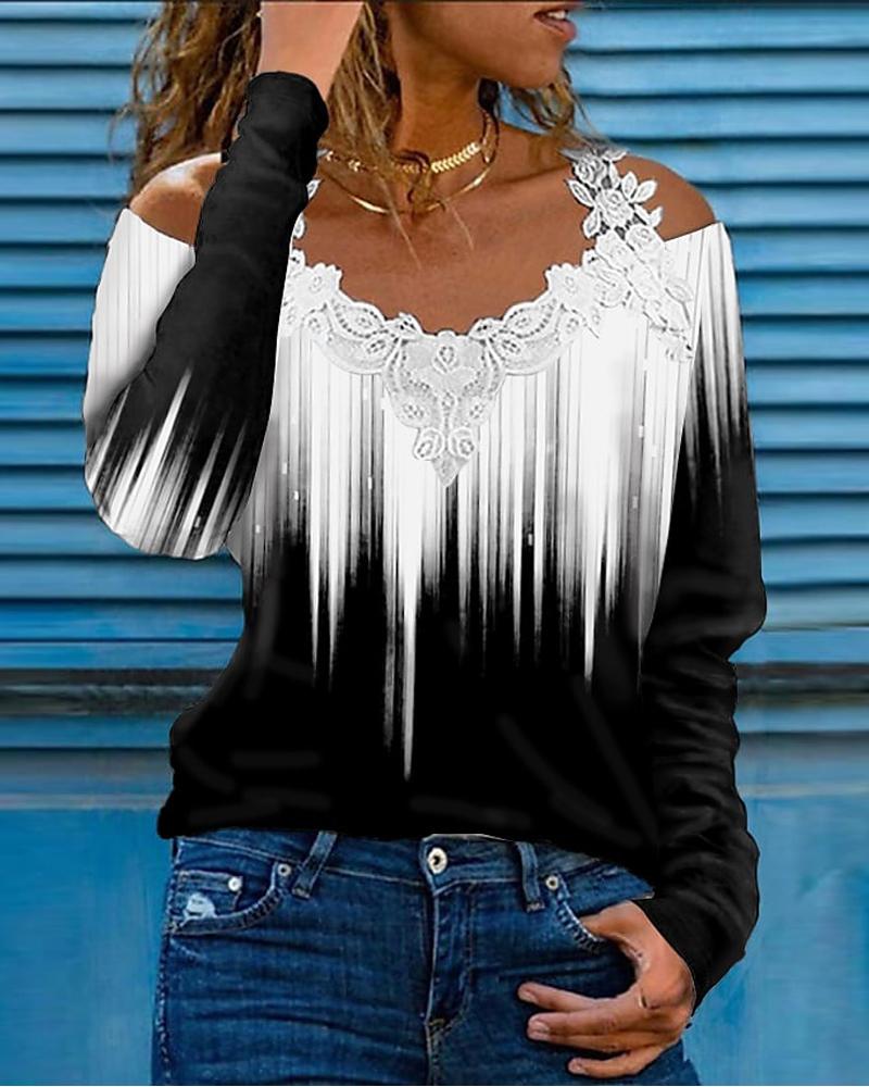 Style:Casual Type:Tee Material:97%Polyester,3%Spandex Neckline:Cold Shoulder Sleeve Style:Long Sleeve Length:Regular Pattern Type:Ombre,Tie Dye Decoration:Contrast Lace Fit Type:Regular Occasion:Daily Package Include:1*Top