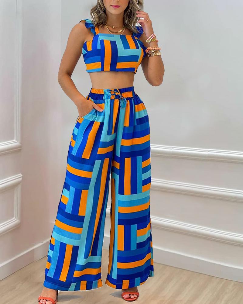 Style:Casual,Chic Type:Pants Sets Material:Polyester Neckline:Square Neck Sleeve Style:Sleeveless Length:Long Pattern Type:Geometric Decoration:Drawstring,Pocket,Tied Detail Fit Type:Regular Occasion:Daily Package Include:1*Pants Set
